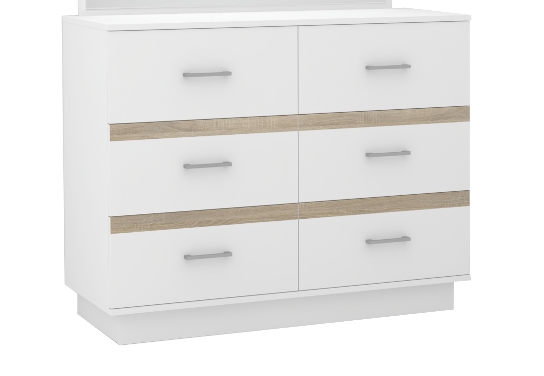 Коллекция выполнена из ЛДСП 18мм в контрастном сочетании декоров Дуб Сонома и Белый.Комод широкий оснащен телескопическими шариковыми направляющими полного выдвижения.Лицевая фурнитура - металлическая ручка-скоба.