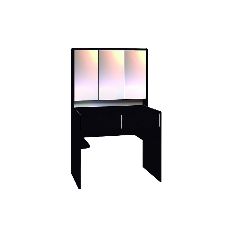 Туалетный столик — трельяж. Это один из самых желанных предметов мебели для женщин. Зеркало с одной стационарной и двумя подвижными створками позволяет разглядеть себя со всех сторон. Трельяж с зеркалом идеален для тех, кто любит следить за своей внешностью, ухаживать за лицом, делать прически и укладки. Просторная столешница со скругленными углами и зеркала создают ощущение комфорта и легкости. Ящики туалетного столика декорированы белой кромкой 2 мм. Ряд стеклополок (стеклополка толщиной 4 мм, по 2 с каждой стороны) скрыт за зеркальными створками. Здесь возможно «спрятать» и аккуратно расставить баночки с кремами и любимые парфюмы. Под столешницей трельяжа предусмотрены полочки со скругленными углами для хранения высоких флаконов со средствами по уходу за волосами, антистатиков, высоких коробочек, т.е. для всего того, что ежедневно необходимо каждой женщине, но очень загромождает столешницу туалетного столика. Выпускается только в декоре Венге.
