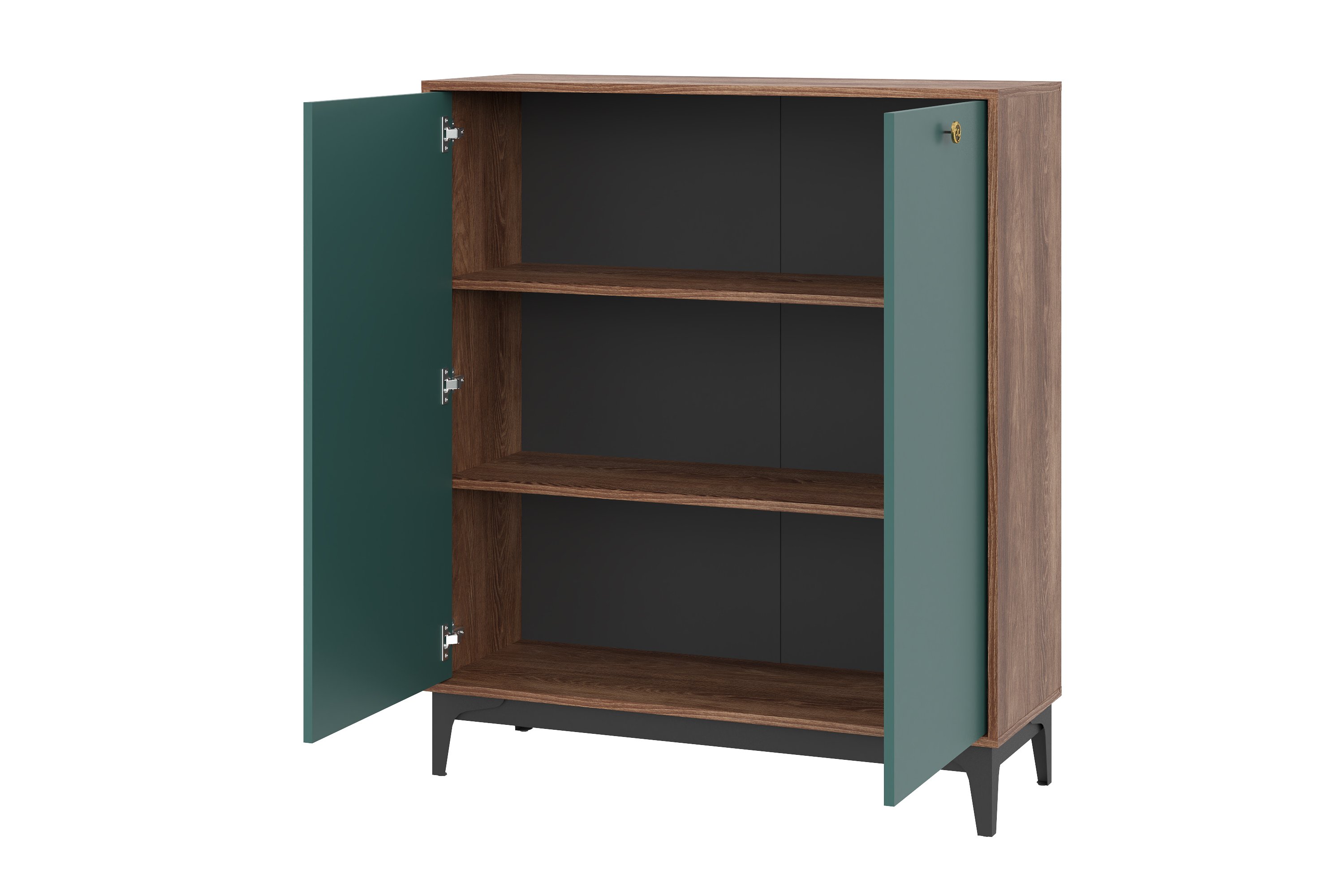 Гостиная Брасс — элегантное решение для оформления интерьера.остиная BRASS никого не сотавит равнодушным и впишется в любой стиль интерьера.Изысканность мебельной фурнитуры и сочетание зеленых фасадов с древесным оттенком корпуса. Также возможно исполнение фасадов синего цвета, зеленого и черного глянца.Комод КМ-2 с закрытыми полками.Петли и направляющие с доводчиками.