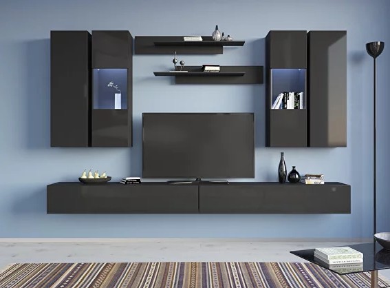 Монолитное исполнение гостиной Поинт без внешней фурнитуры станет стильным дополнением современного интерьера. Внутреннее наполнение представлено множеством полок. Открытая ниша в центральной части разделена на две секции стеклянной полкой, которая дарит расположенным на ней предметам эффект парения.