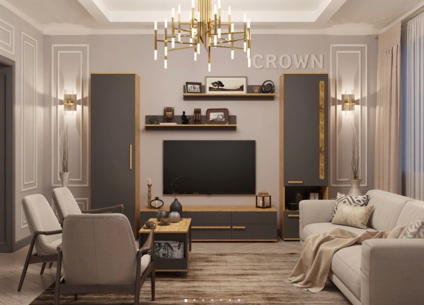 Коллекция «Сrown» в цвете «Дуб золотистый/Графит» вдохновляет дизайнеров роскошных апартаментов в различных стилях от минималистичного лофта до модного скандинавского эко-стиля. Мебельная фабрика г. Глазов создает эксклюзивную коллекцию, которая объединяет в себе тёплую приятную на ощупь текстуру дерева в цвете «Дуб золотистый» и роскошную эксклюзивную поверхность фасадов в тёмном и глубоком цвете «Графит».Отсутствие видимой фурнитуры и сложного декора делает коллекцию универсальной для разнообразно стилизованных помещений и оставляет место для наполнения интерьера приятными мелочами. Мебель из коллекции «Сrown» подойдет для экспериментов с темными оттенками в интерьере. Это элегантное и стильное цветовое решение рекомендовано для гостиных в стиле лофт, урбан, гранж, хюгге или эклектичных экспериментов. Однако коллекция мебели отлично впишется и в более «домашние» современные интерьеры — достаточно лишь включить в отделку кремовые, желтые и песочные оттенки.Наша коллекция «Сrown» — это функциональное модульное решение.