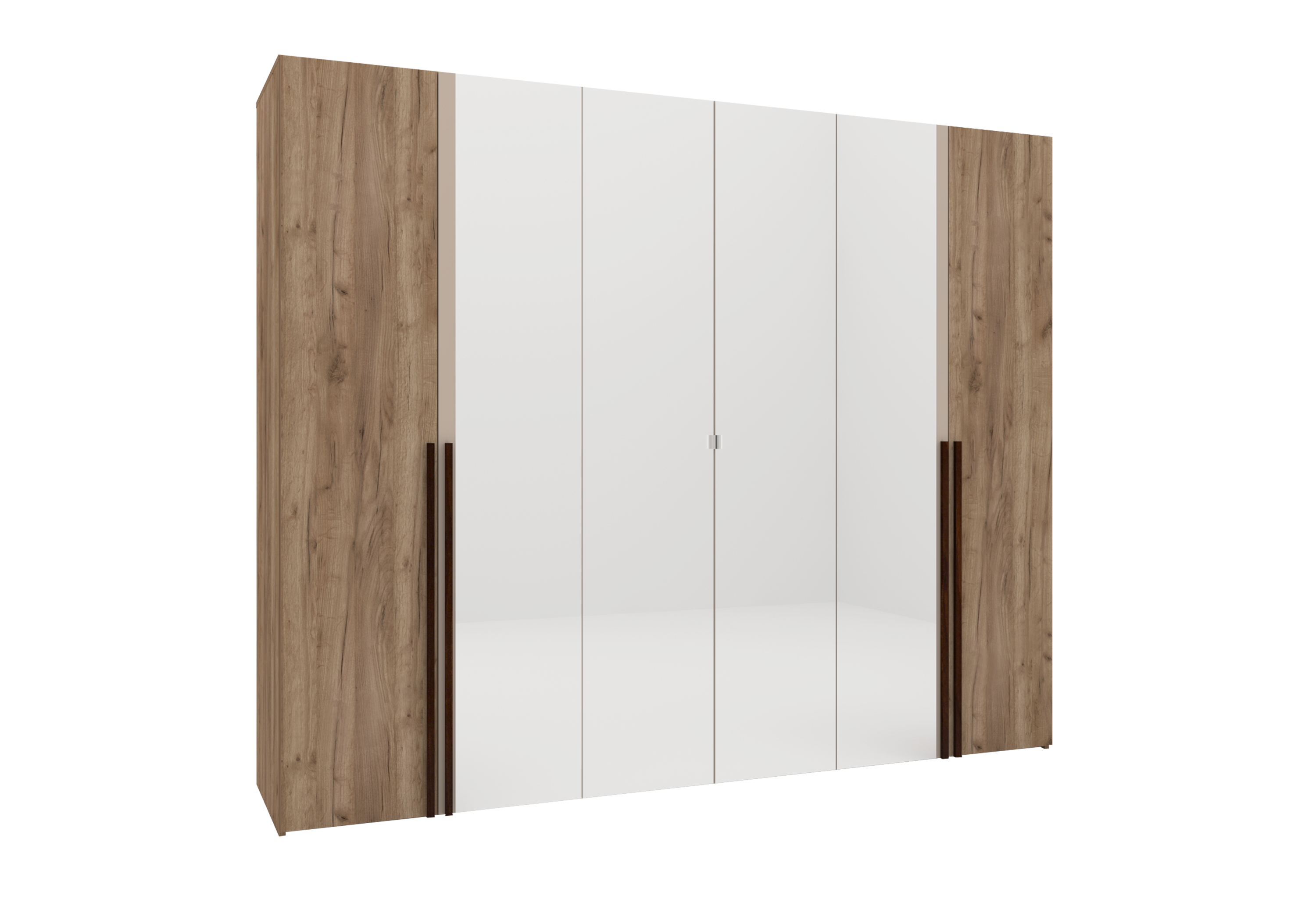 Коллекция выполнена из ЛДСП 18мм в контрастном сочетании декоров Дуб Табачный и Велюр. 6-створчатые шкафы для одежды и белья оснащены стационарными штангами для одежды на плечиках и полками для хранения белья.Лицевая фурнитура - ручки из массива дерева.