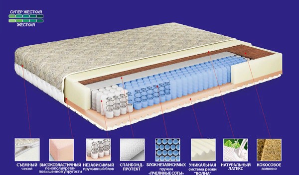 Пружблок: независимые пружины ANTINOISE повышенной упругости и переменной жесткости, высотой 220-240 мм, упакованные в отдельные пакеты высотой 170-175 мм, закрытые нетканым материалом «СПАНБОНД-ПРОТЕКТ» с двух сторон. Пружблок имеет 3 зоны жёсткости. Он обеспечивает высокую точечную упругость и поддержку тела при очень высокой допустимой нагрузке и обладает повышенной комфортностью.Уникальная резка пенополиуретана, создающая массажный и «растягивающий» эффект позвоночника.Натуральный кокос в сочетании с натуральным латексом.9 зон комфорта.Сертификат пенополиуретана CertiPUR.Матрас двусторонний. Одна сторона супер-жесткая, вторая - жесткая.Высота около 23 см.Допустимая постоянная нагрузка на одно спальное место 180 кг.Декларация соответствия нормам безопасности.Любой размер.Тестирование 100 дней на соответствие жесткости и комфорта.