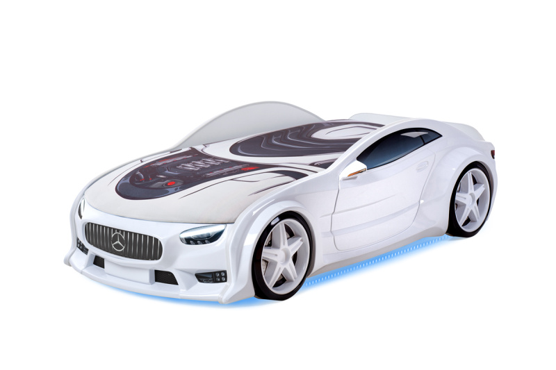 Эта крутая кроватка-машина серии UNO создана специально для юного гонщика: корпус стилизован под автомобиль марки Mercedes. Стильные принты на «бампере» и бортах защищены от истирания матовой ламинацией. Чтобы сделать эту модель еще более реалистичной, мы разработали для нее ряд классных опций на выбор. Подсветка фар управляется сенсором, многорежимная подсветка дна на пульте управления создает настроение. Мягкий задний спойлер придаст кроватке-автомобилю еще более внушительный вид. А с именным порядковым номером ваш маленький стрит-рейсер почувствует себе увереннее и круче!Кроватка-машинка не только красива, но и безопасна: скругленные формы и защищенные мягким кантом грани оберегают малыша от ушибов при активных играх. Кровать оснащена матрасом с ортопедическим эффектом на подъемном механизме, под которым находится вместительный ящик для хранения.Для придания реалистичного вида кроватке-машинке Вы можете дополнительно приобрести комплект объемных колес.