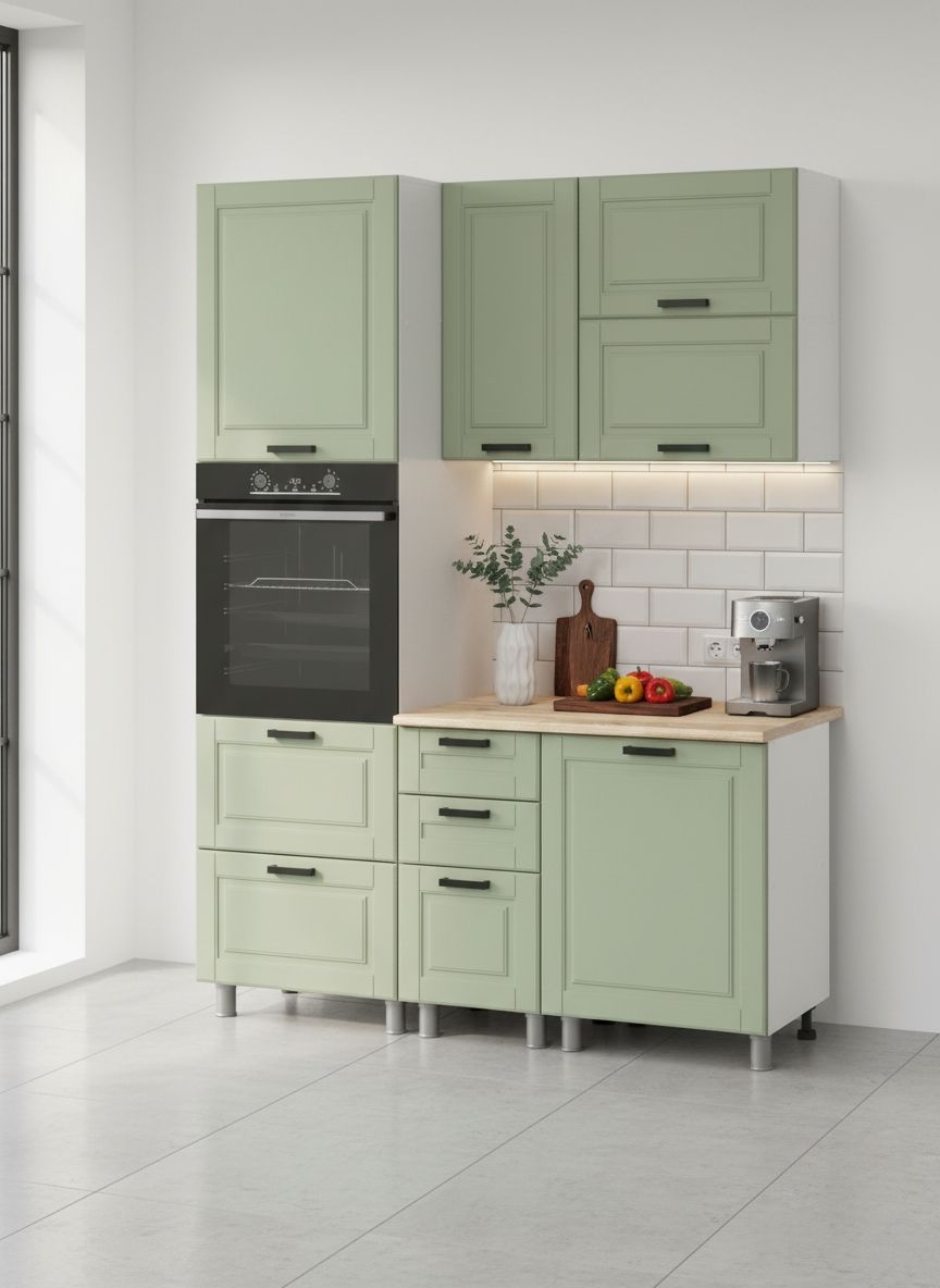 Характеристики:Фасад:— МДФ + пленка ПВХ (производство: Корея)— Пропил для стыковки с HDF— Универсальность верхних и нижних фасадов— Устойчивы к выцветанию— Имеют однородный оттенокКорпус:— Белый ЛДСП 16 мм— Кромка ПВХ в цвет корпуса— Глубина верхних модулей — 350мм— Глубина нижних модулей — 478ммФурнитура:— Шариковые направляющие, усиленные (до 50 кг)— Навес мебельный для верхних модулей (Краб)— Петли без доводчика, усиленные— Лицевые, модельные опоры, регулируемые (100 – 120 мм), цвет: Серебро— Задние, технические опоры, регулируемые (100 – 120 мм), цвет: Черный— Ручка скоба пластик, цвет: Черный матовыйВ комплект не входит стеновая панель, пристеночный плинтус и комплектующие к ним (алюминиевые планки, комплект заглушек). Заказываются отдельно.Посудосушитель в состав комплекта НЕ входит и приобретается отдельно.Универсальная сборка.