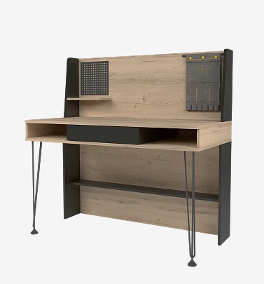 Компьютерный стол из коллекции Александрия станет украшением и функциональным атрибутом любой молодежной комнаты.Он выполнен по канонам современного стиля Лофт. Передние опоры изготовлены из металла и регулируются по высоте. Они придают конструкции утонченность и легкость. Компьютерный стол имеет маленькую полочку слева и широкую нишу под столешницей с выдвижным ящиком посередине В комплекте идет магнитная перфорированная доска для заметок и текстильный подвесной органайзер для ручек и карандашей.
