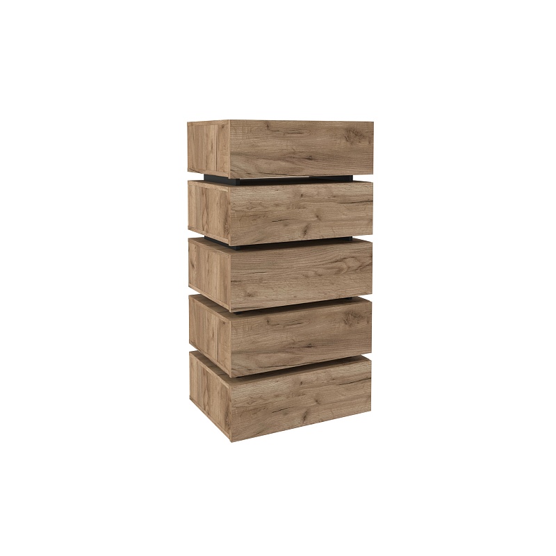 Для маленькой гостиной отлично подойдет высокий и узкий комод Nature 6. Гладкие фасады ящиков в теплом декоре Дуб Табачный Craft с контрастными черными боковыми планками снизу делают его по-настоящему особенным. Пять выдвижных ящиков глубиной 14 см способны вместить все необходимое, а компактная конструкция сэкономит место в комнате. Ящики легко открываются за свес благодаря направляющим полного выдвижения. Они быстро и легко устанавливаются при сборке комода. Регулируемые опоры компенсируют незначительные неровности пола.