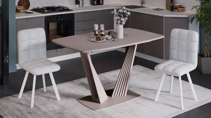 В данную обеденную группу входит : 1. Обеденный стол ФАБИО отличается невероятно стильным дизайном, основной акцент которого сделан на подстолье. Опоры V-образной формы выполнены из металла и имеют эффектный декор в виде гофрированных складок. Широкая столешница выполнена из ЛДСП 16 мм и покрыта закаленным стеклом 4 мм с кромкой ABS. Основание стола также выполнено из металла, что придает модели дополнительную устойчивость. Стол ФАБИО имеет надежный ручной синхронный механизм раздвижения со вставкой «бабочка», которая укладывается вручную. В разложенном виде поверхность стола составляет 1,7 ме