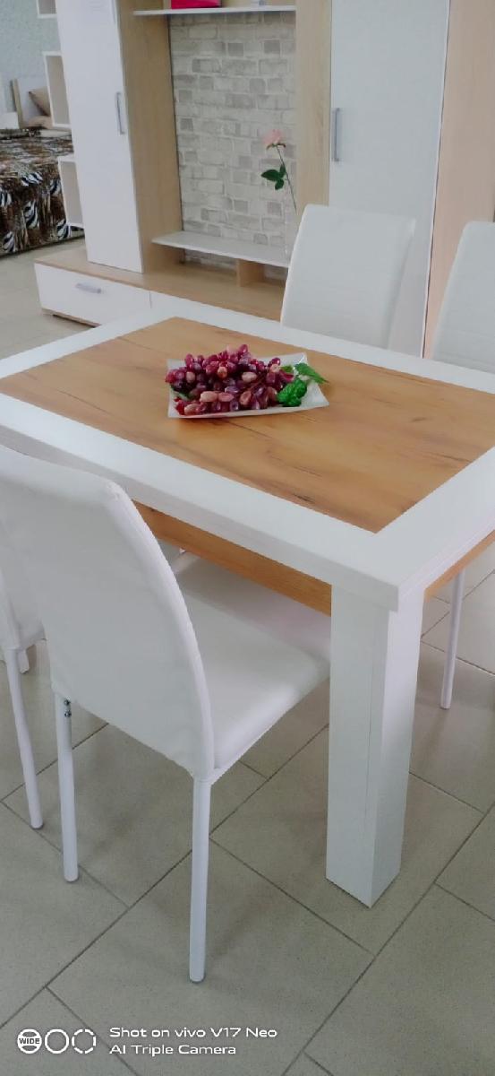 В данную обеденную группу входит : 1.Раздвижной кухонный стол Хьюстон придется по душе тем, кто любит принимать гостей и устраивать семейные праздники. Модель выполнена в современном стиле, выделяется на фоне аналогов оригинальной комбинированной расцветкой и широкими устойчивыми опорами L-образного сечения. Особенно эффектно такой стол будет смотреться в помещении, оформленном в стиле лофт. Основные элементы конструкции изготовлены из ЛДСП с торцевой кромкой ПВХ. Модель имеет направляющие для ручного выдвижения боковых вставок, скрытых в столешнице. Это позволяет при необходимости создать до