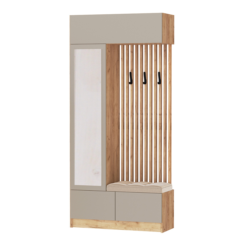 Благодаря стильному дизайну и компактным размерам вешалка Руэлла впишется в малогабаритную прихожую или квартиру-студию. Наличие полок, надежные крючки и ниша под обувь позволят разместить верхнюю одежду, уличную и домашнюю обувь, сезонные аксессуары и головные уборы, а наличие мягкого сидения добавит комфорта от ежедневных сборов перед выходом на улицу.Особенности— Материал корпуса: ЛДСП— Материал фасада: ЛДСП— Отсутствие лицевой фурнитуры— Комплектуется накладными петлями (прямыми)— Механизм открывания Push-to-Open— Мягкое сиденье для центральной секции входит в комплект
