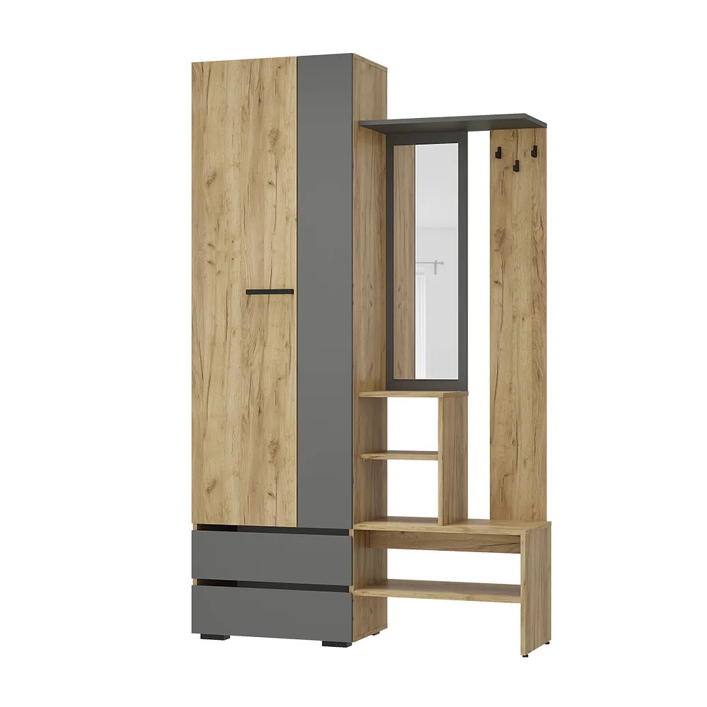 Комплект включает шкаф для верхней одежды и настенную тумбу с зеркалом. Закрытые дверцами модули гарантируют порядок в коридоре.Особенности:— Материал корпуса: ЛДСП— Материал фасада: ЛДСП— Тип направляющих: Шариковые— Кромка — ПВХ крафт 0,4×19 мм, ПВХ графит 0,4×19 мм, ПВХ крафт 0,4×26 мм.— Опоры — регулируемые, подпятник, пластик h-20мм.— Ручка — накладная, пластик, 160 мм.— Петли створок — накладные.— Евроштанга, сталь.— Фрезеровка 45 гр. на фасаде.— Крепление к стене — уголок овербаланс.— Максимальная нагрузка на вязку/на полку — 10 кг, на ящик/штангу — 5 кг.