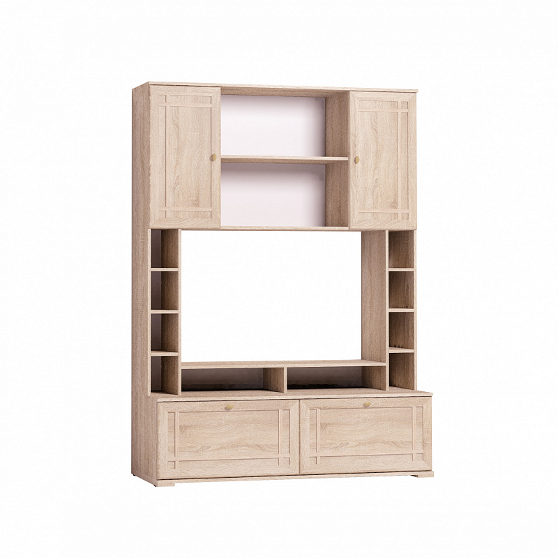 Легкие рамочные фасады модулей коллекции Шерлок декорированы переплетом из МДФ, что дополнительно подчеркивает строгость форм и классический стиль коллекции. Легкий и небольшой по габаритам 1 Шкаф МЦН вмещает телевизор диагональю до 44”: высота ниши 725 мм, ширина - 1154 мм. В боковых стеллажах храните декоративные интерьерные мелочи. Глубина нижних выдвижных ящиков - 400 мм. Они комплектуются шариковыми направляющими, которые обеспечивают им минимальный люфт и высокую прочность. Один ящик выдерживает нагрузку до 20 кг. Подставку на тумбе под ТВ можно закрепить над нишей, как дополнительные вместительные полки.