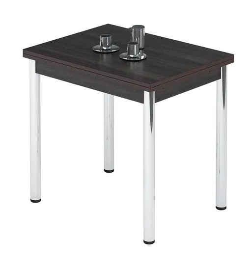 Это то, о чем принято говорить “просто и со вкусом”. Вкус у дизайнера отменный: простой прямоугольник, имитирующий срез натурального дерева и четыре лаконичные цилиндрические ножки с хромированным блеском идеально сочетаются. Чистота пропорций и качество исполнения создают законченный образ и удобную комфортабельную мебель, для которой можно найти место даже в тесном помещении. Скругленные углы удачно гармонируют со всей конструкцией. Конструкторское решение также интересно: выдвижной механизм боковых частей, позволяет увеличивать столешницу на три размера.