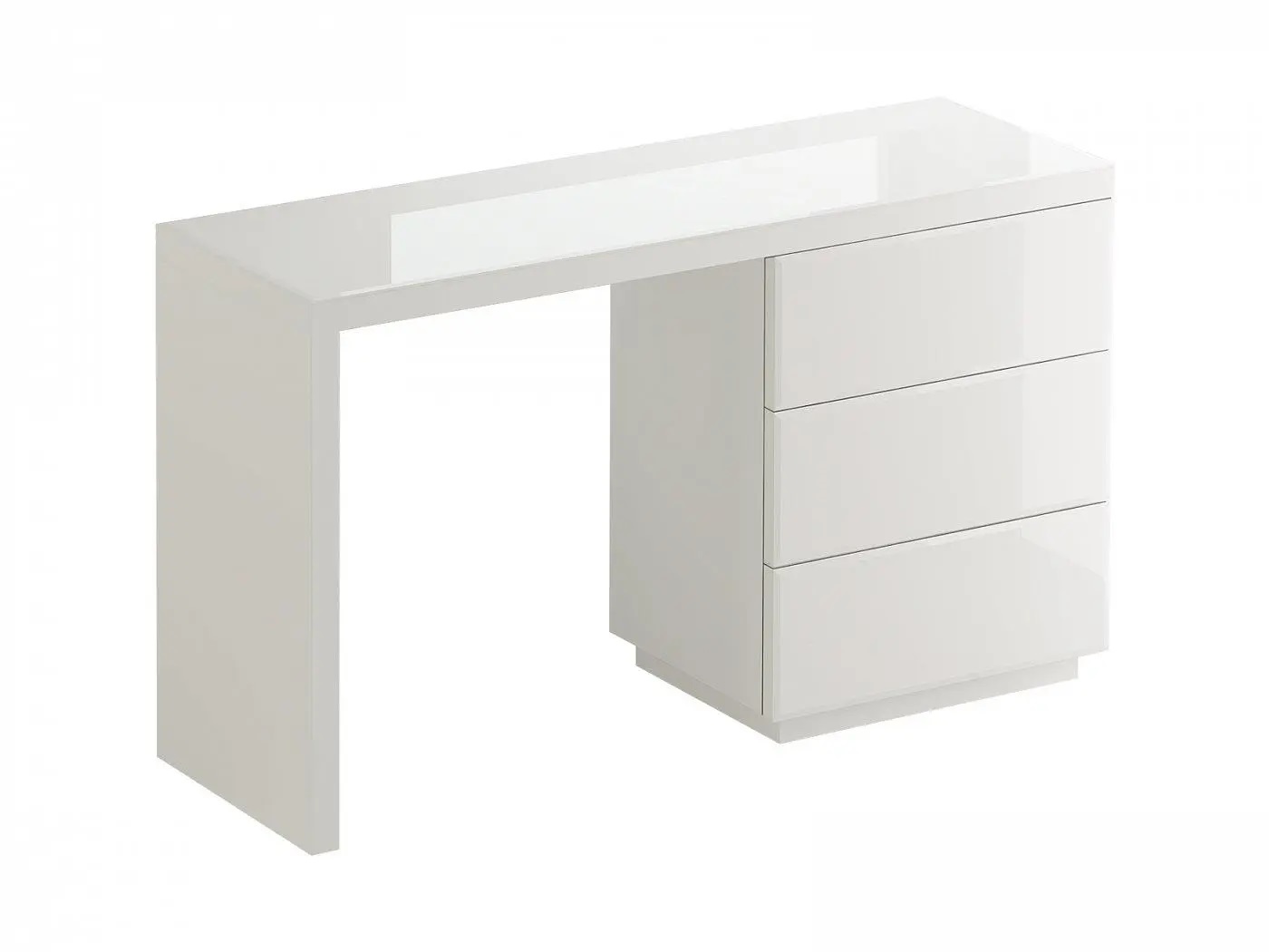 Туалетный столик с тремя выдвижными ящиками. Столешница и фасадные стенки ящиков декорированы стеклом. Стол может быть собран с правым или левым расположением тумбы с ящиками. Ящики открываются по принципу «нажал — открыл».